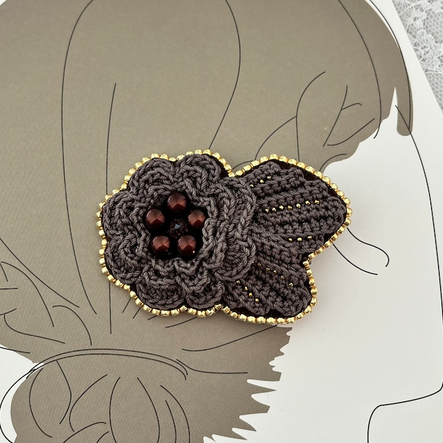 レース編みのお花とビーズ刺繍のヘアクリップ(ダークブラウン)