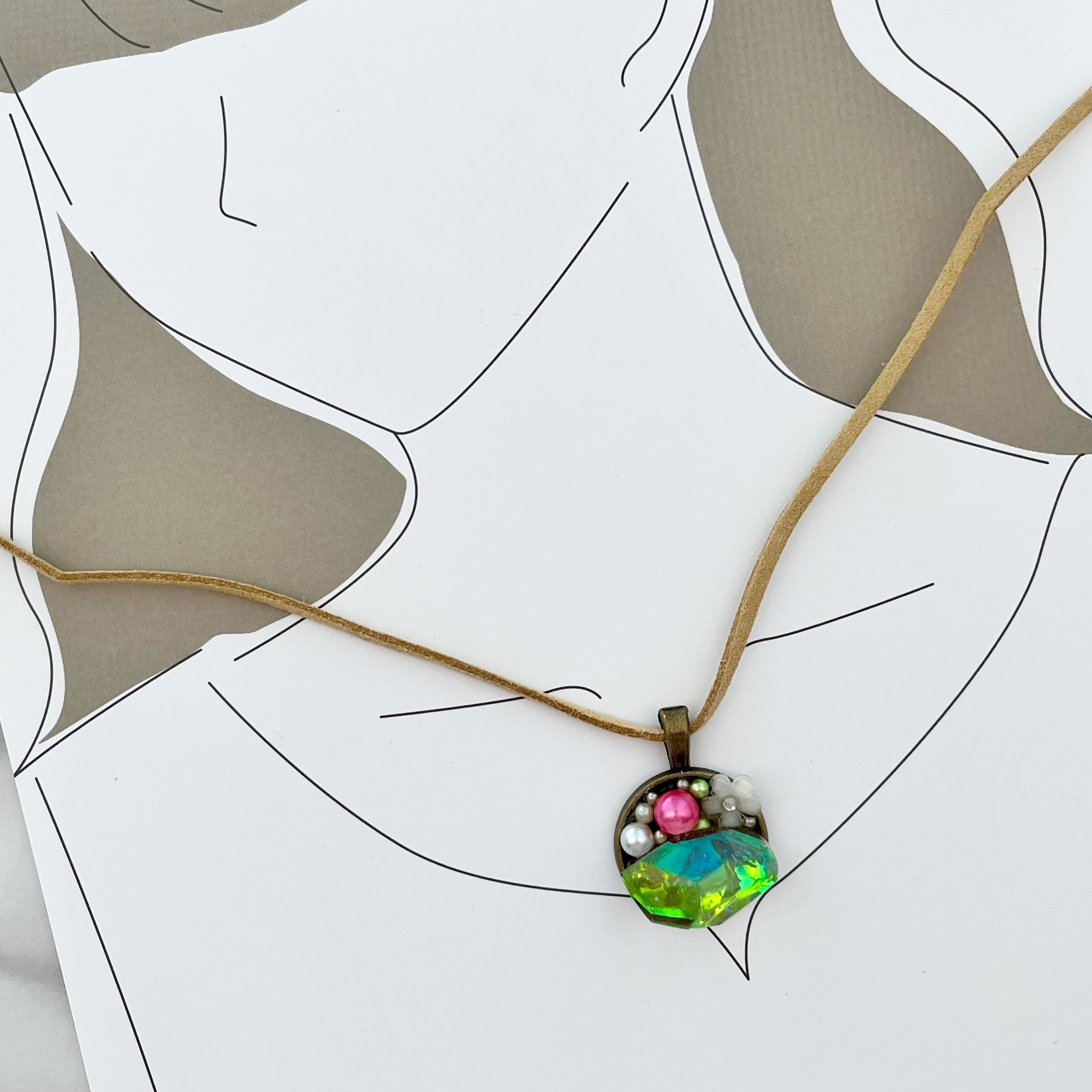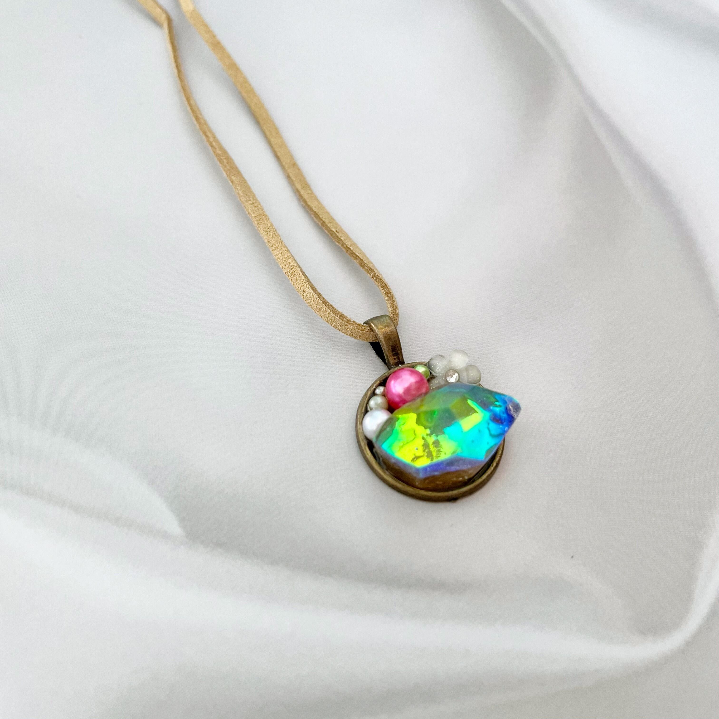 ブルーからグリーンに偏光するレジンのストーンが印象的なペンダント。