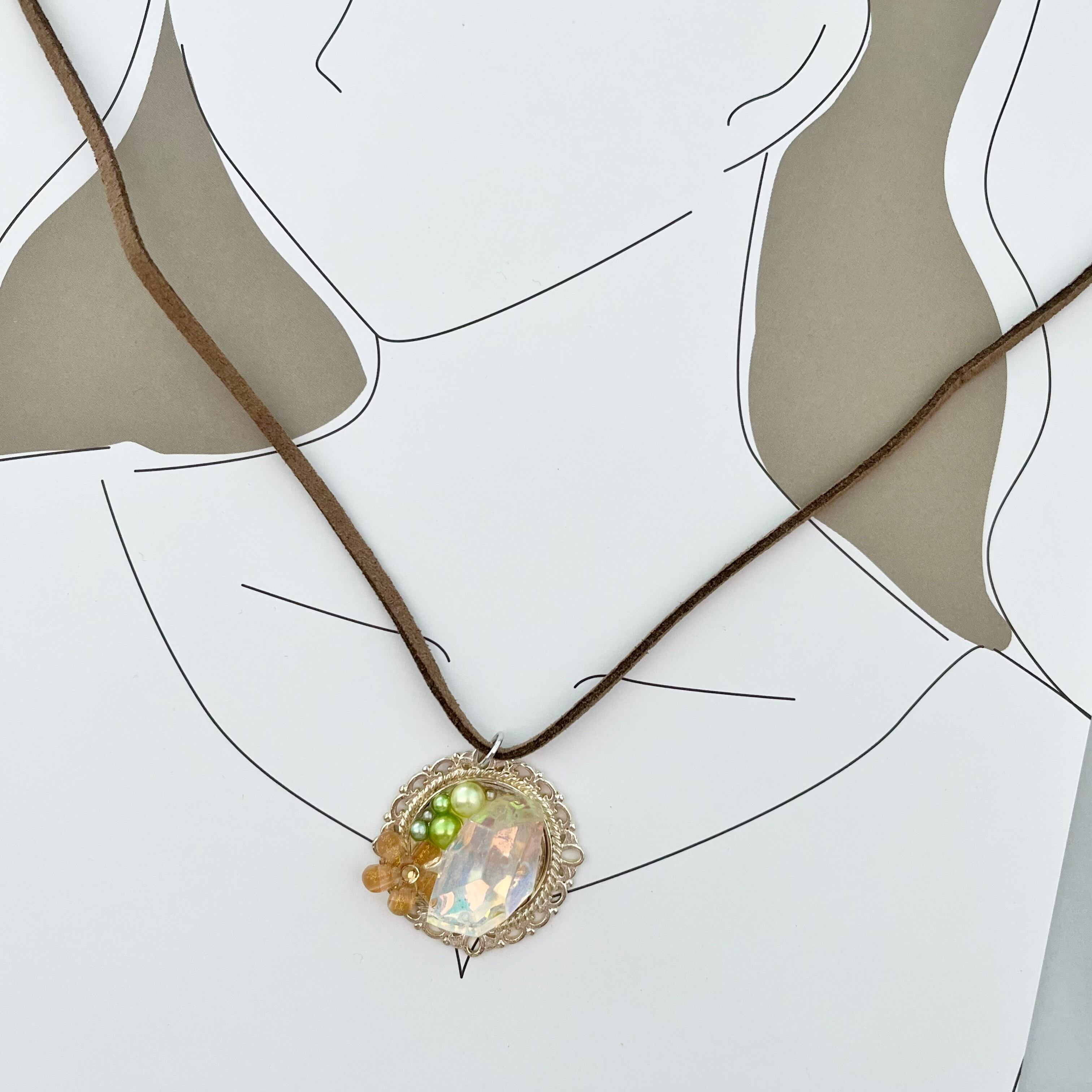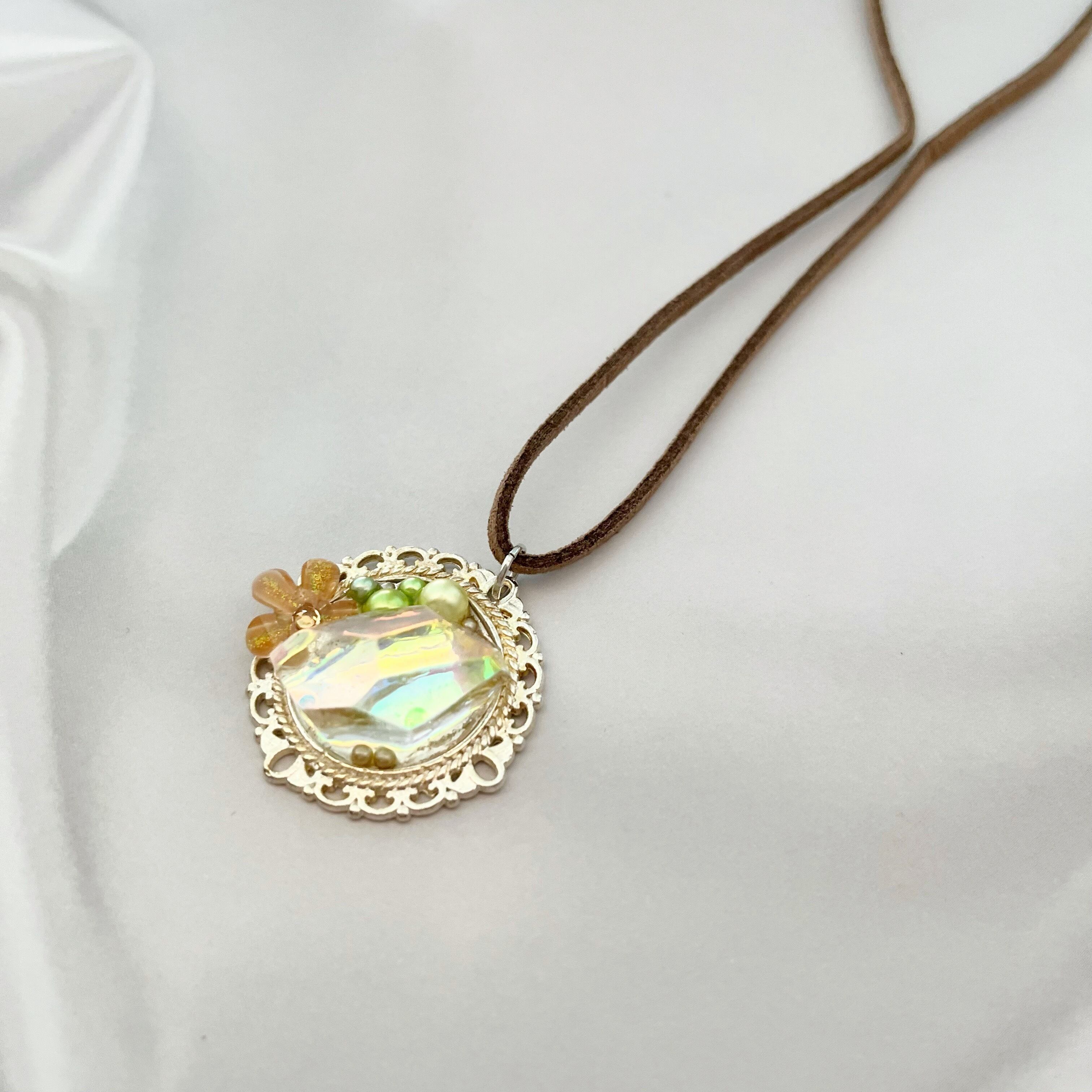 繊細な印象のミール皿とレジンのクリスタルが華やかなペンダント。