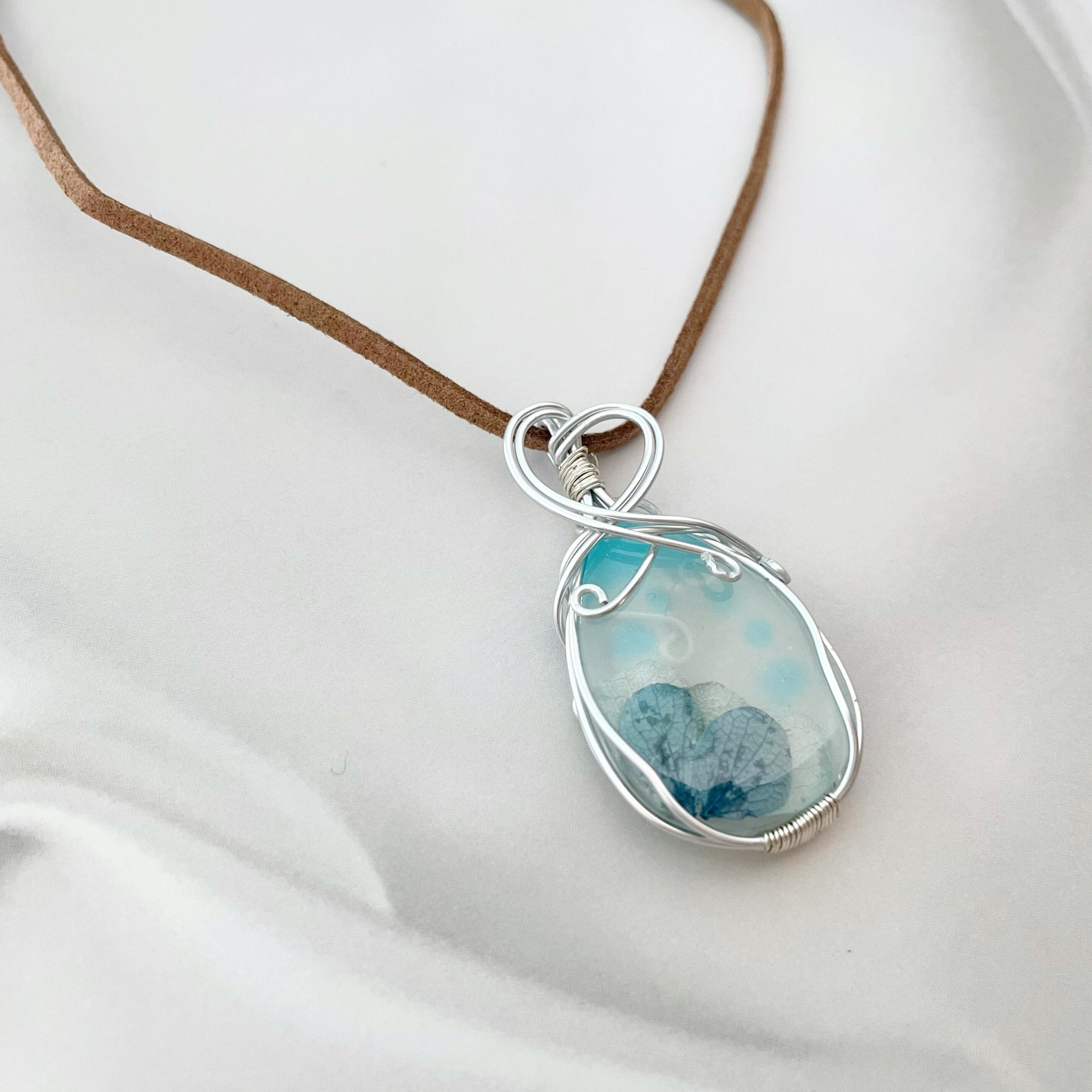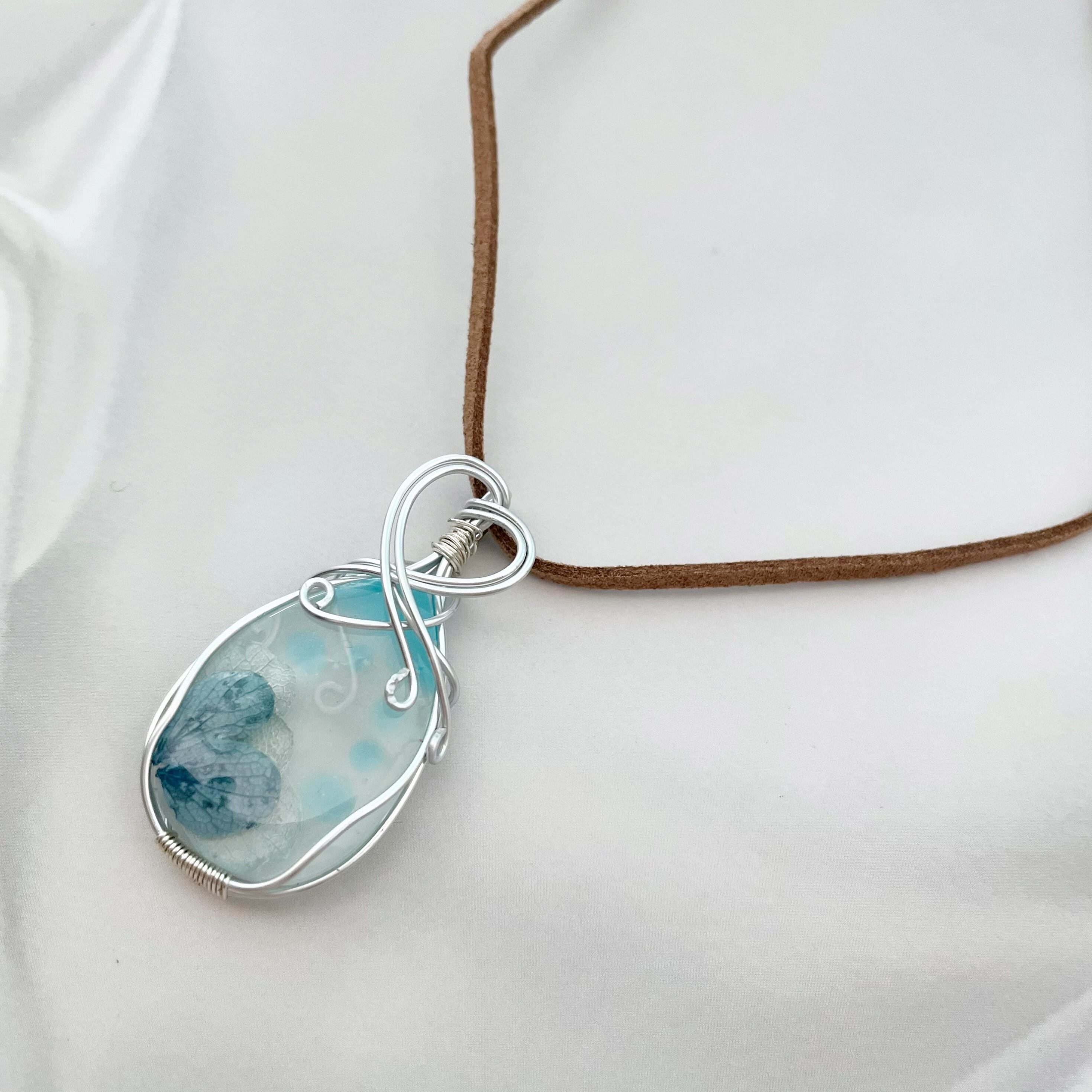 淡い乳白色のレジンの中にドライフラワーが浮かぶ、優しい色合いのペンダント。