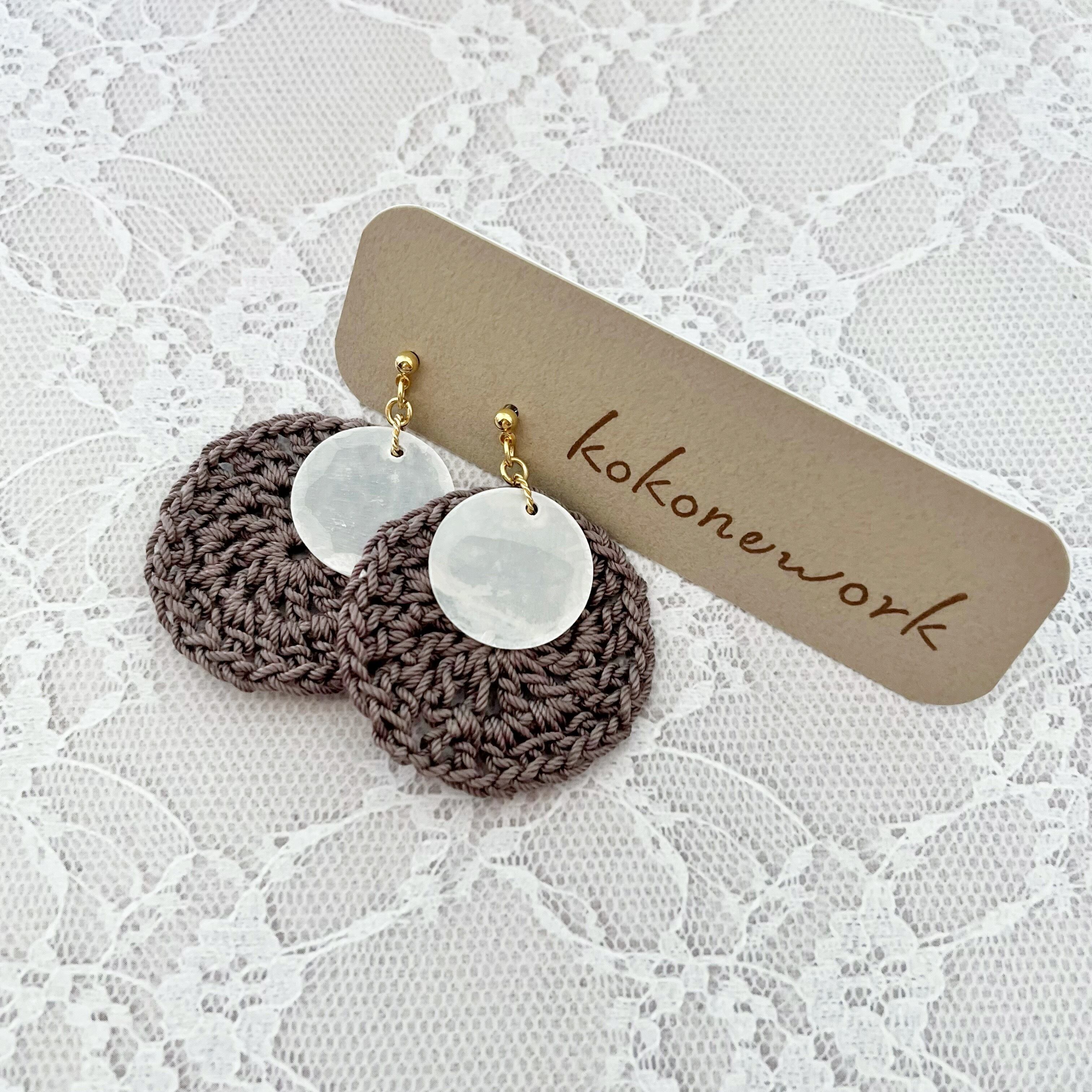 手編みで作ったレース編みのまるいパーツとシェルパーツを組み合わせた耳飾りです。