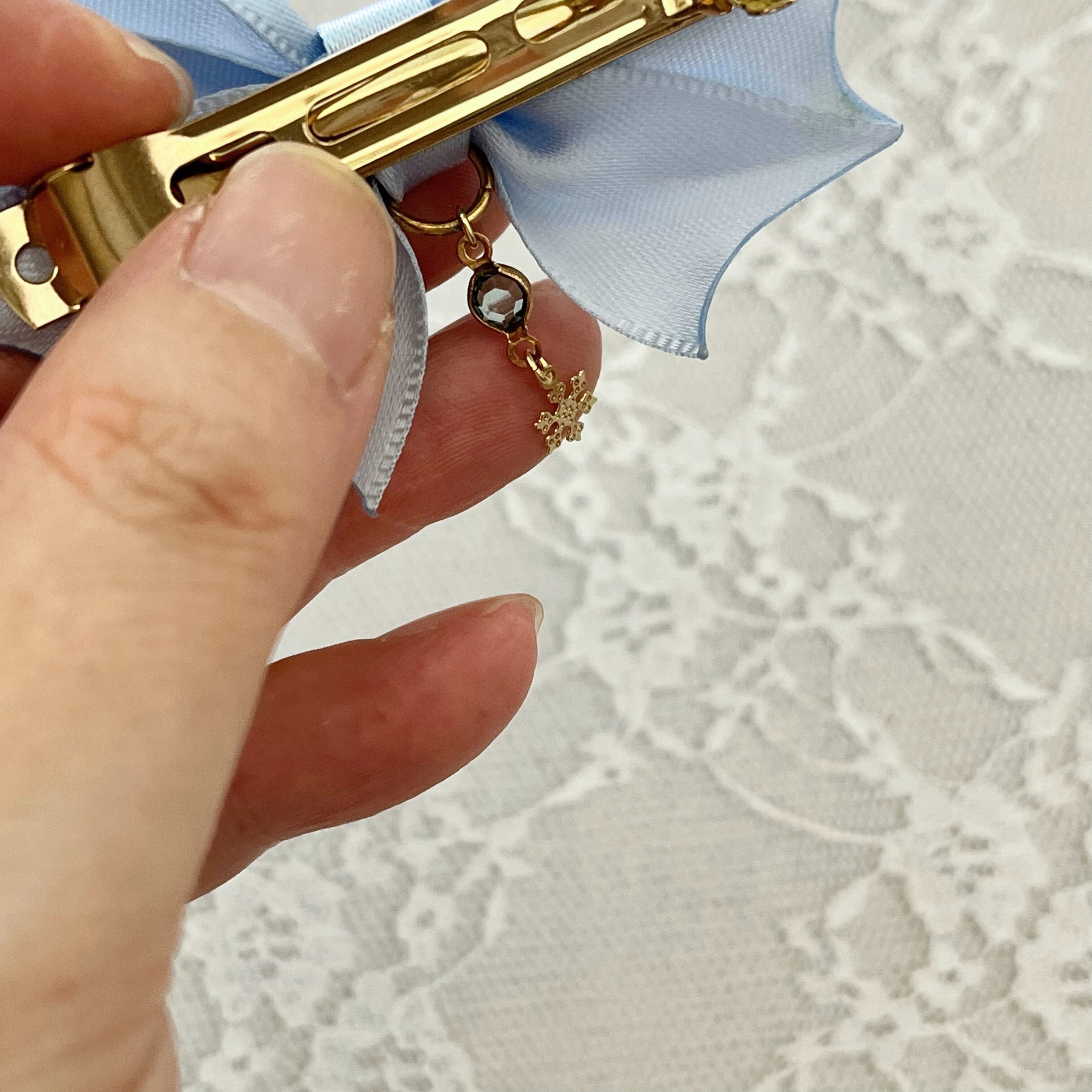 水色のリボン×ゴールドカラーの金具で、涼し気な中に温かみを感じます。