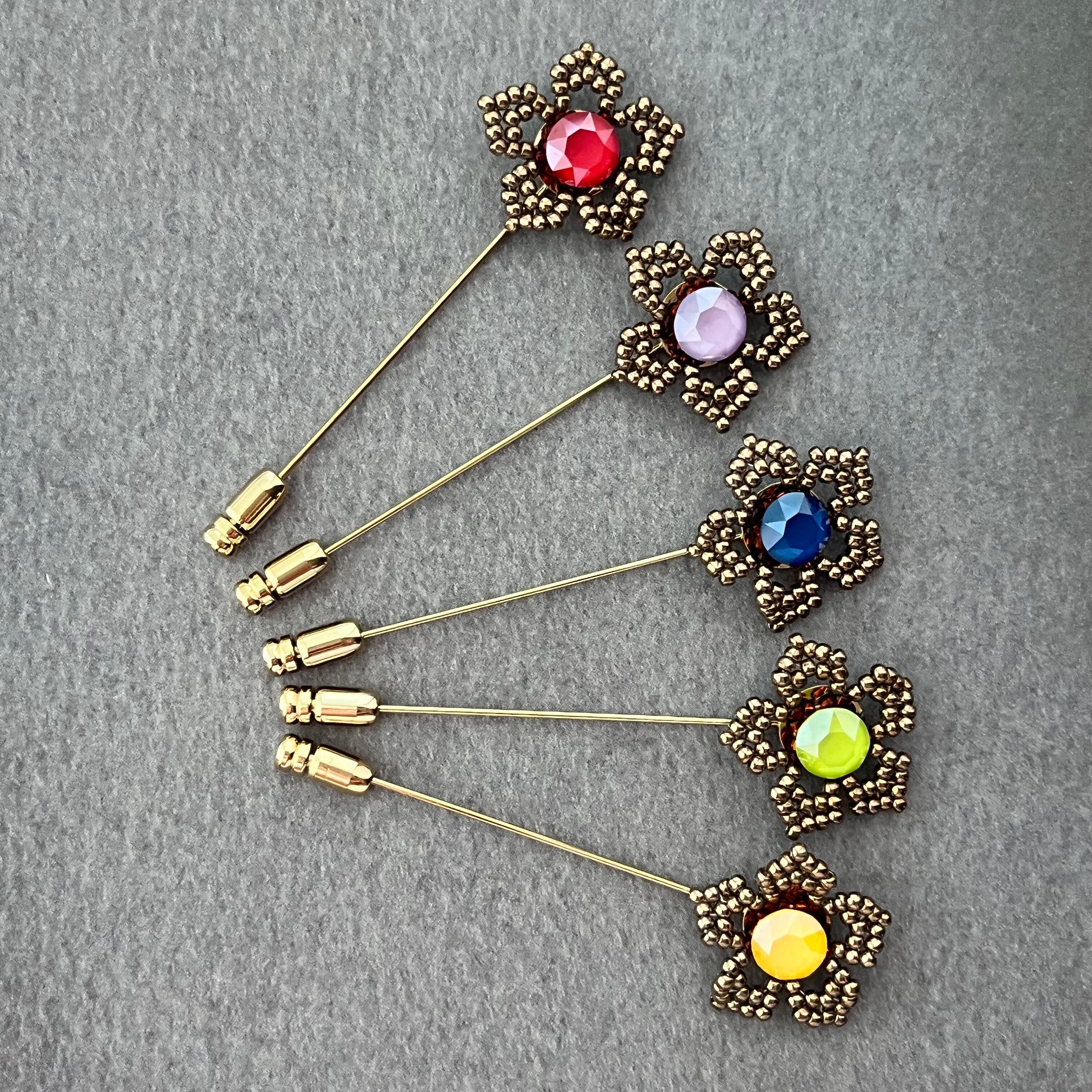 ブロンズカラーのビーズで作ったお花の中央にレッドの大粒カラークリスタルをあしらった、ハットピンタイプのブローチです。