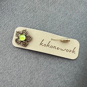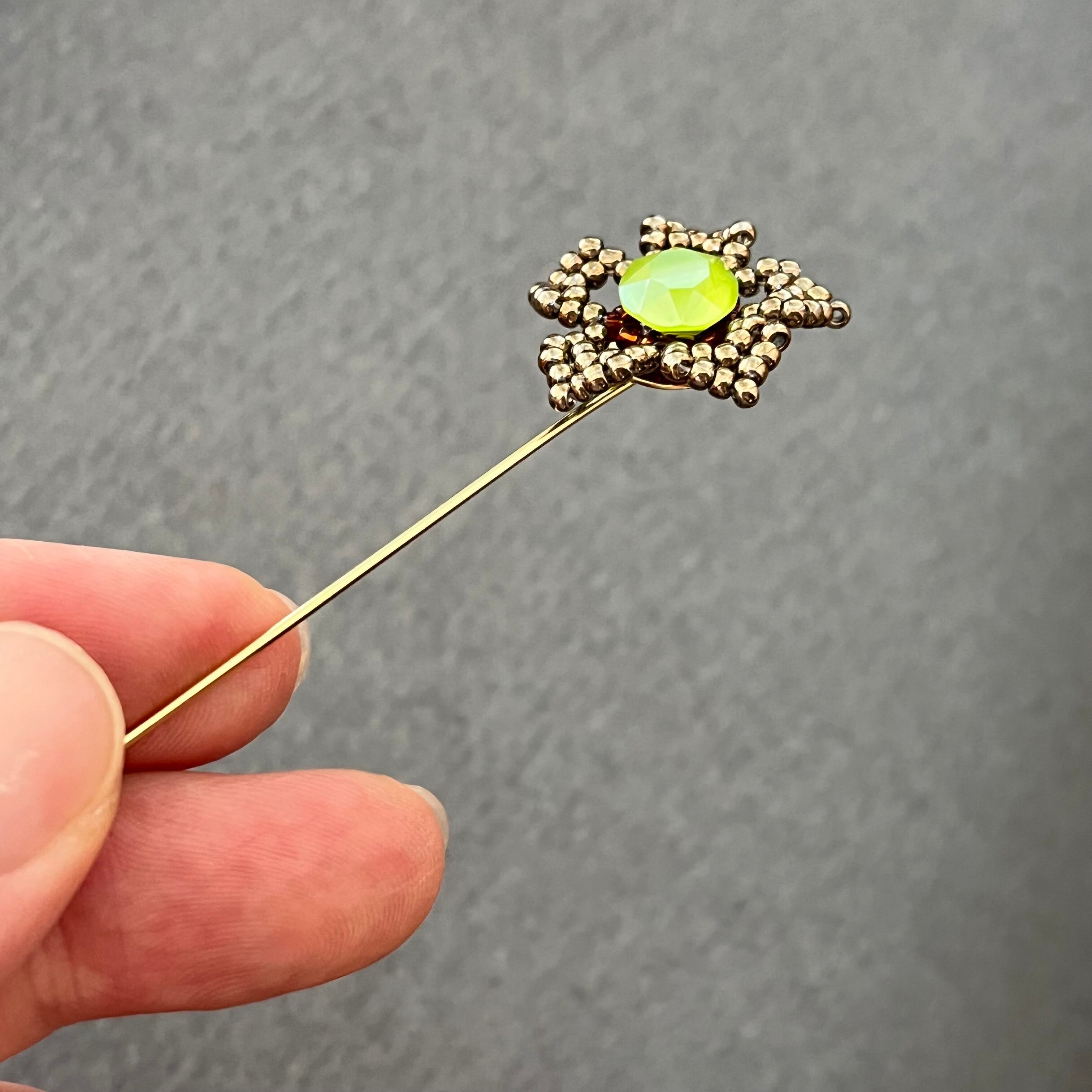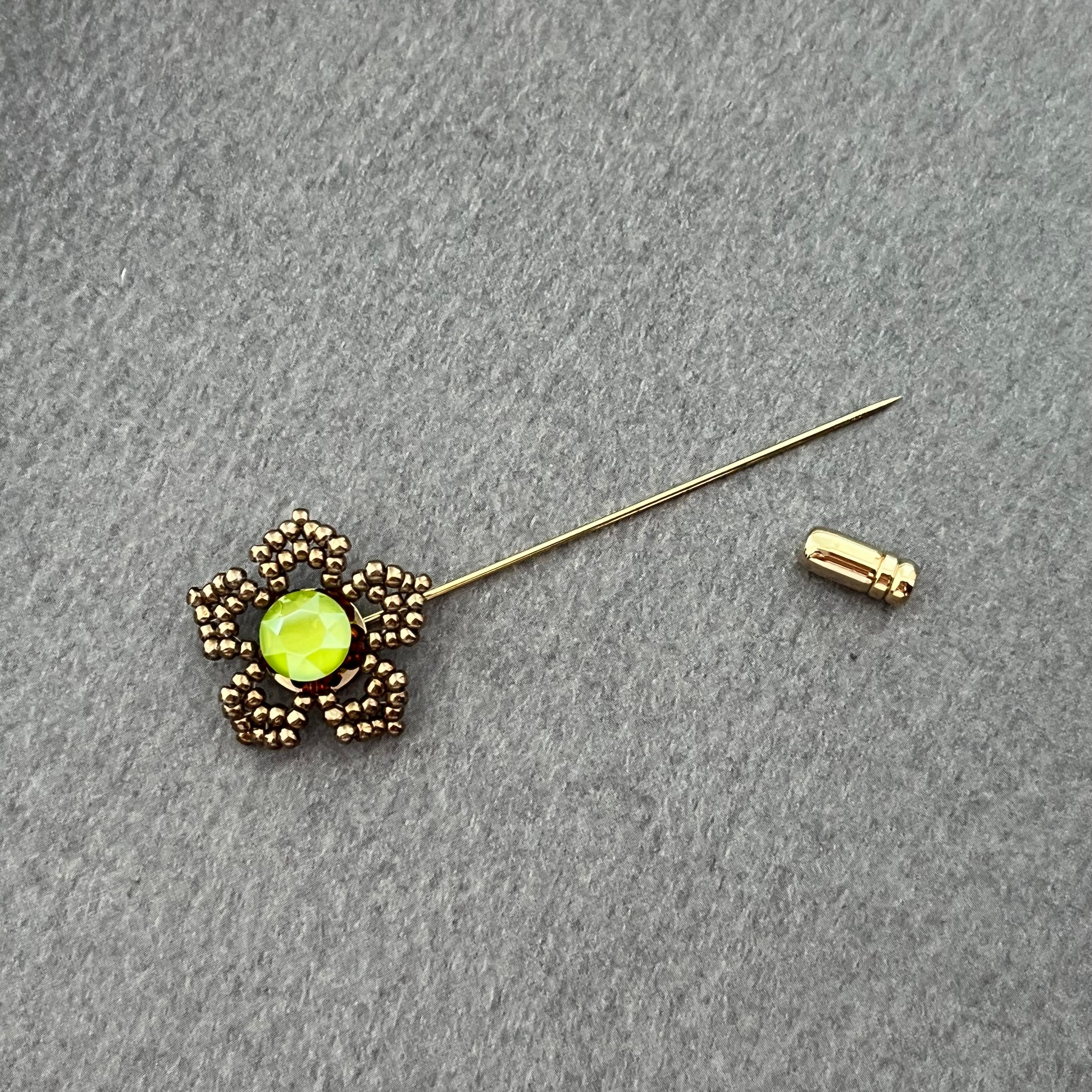ブロンズカラーのビーズで作ったお花の中央にシトラスグリーンの大粒カラークリスタルをあしらった、ハットピンタイプのブローチです。