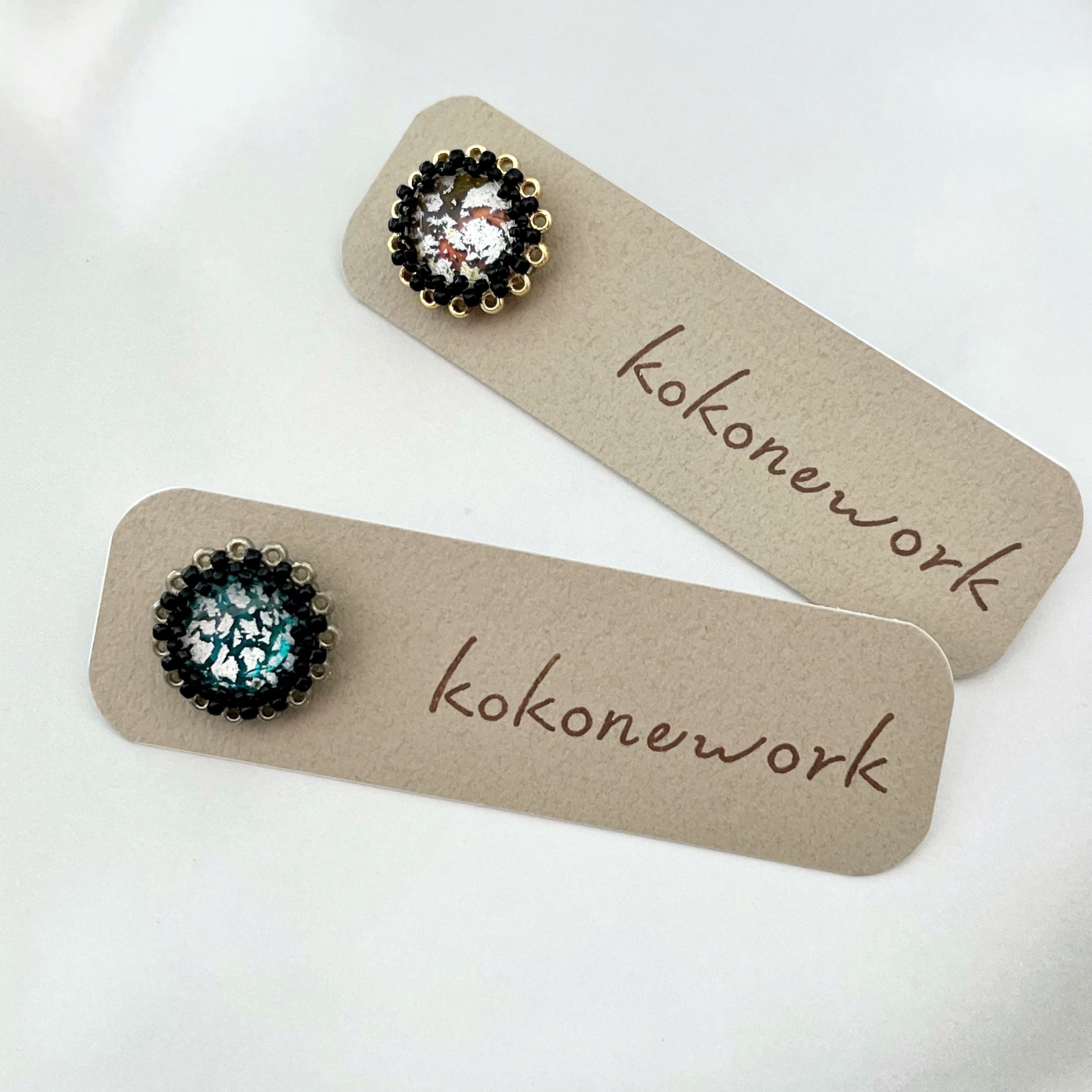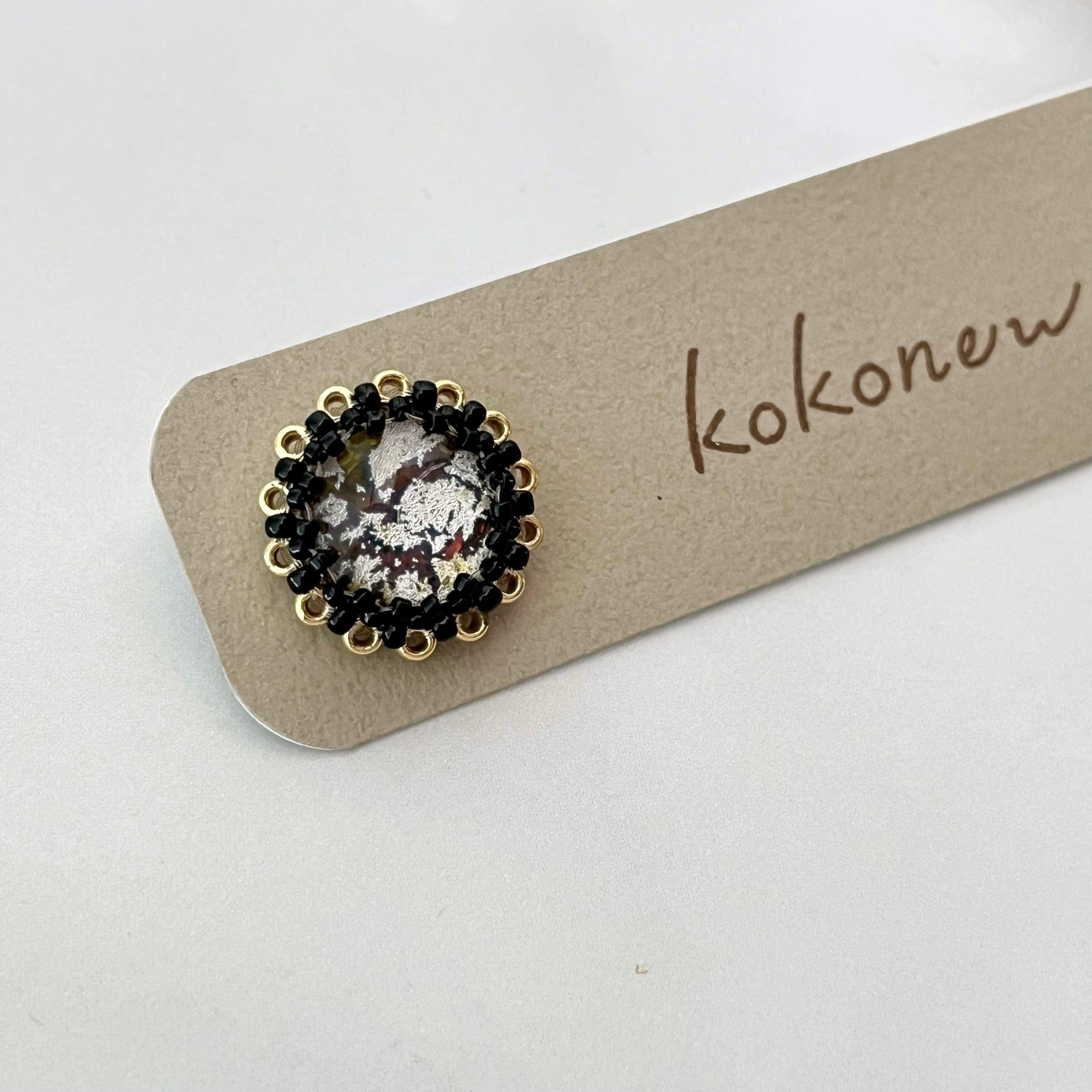 銀箔が入ったガラス製のカボションを、ビーズでフレーミングしたピンバッジタイプのブローチです。