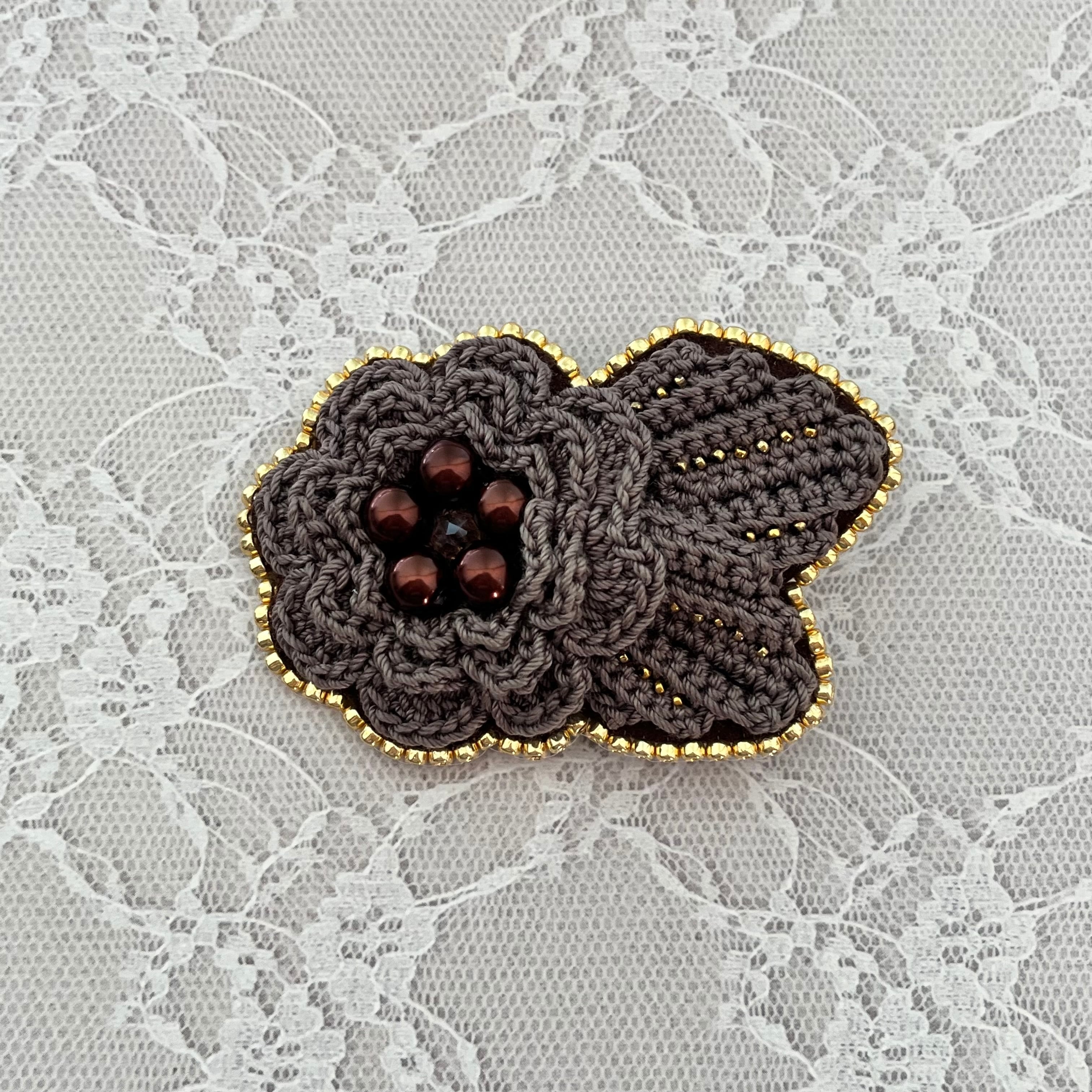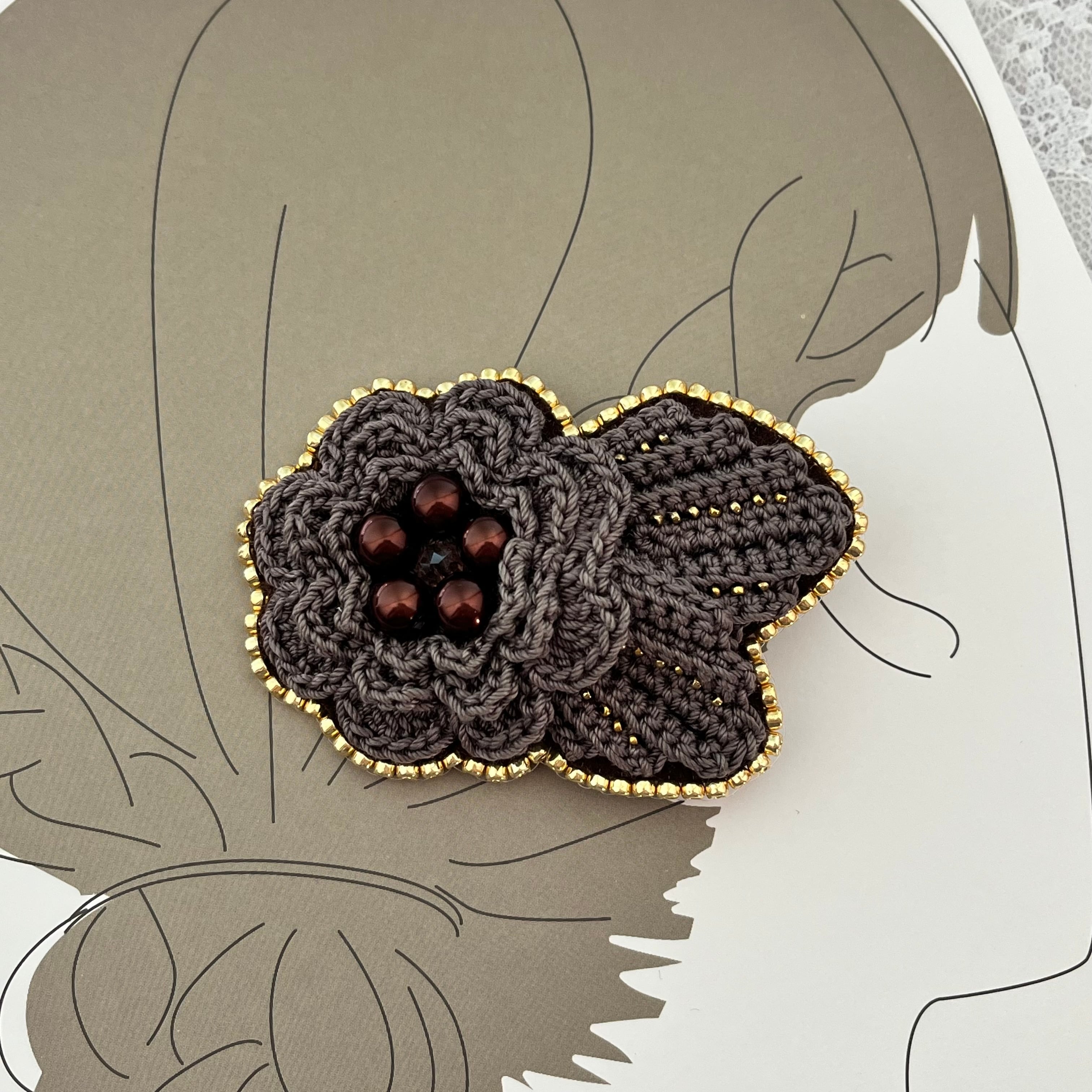 落ち着いたダークブラウンのフラワーパーツを、ゴールドのビーズで縁取りました。