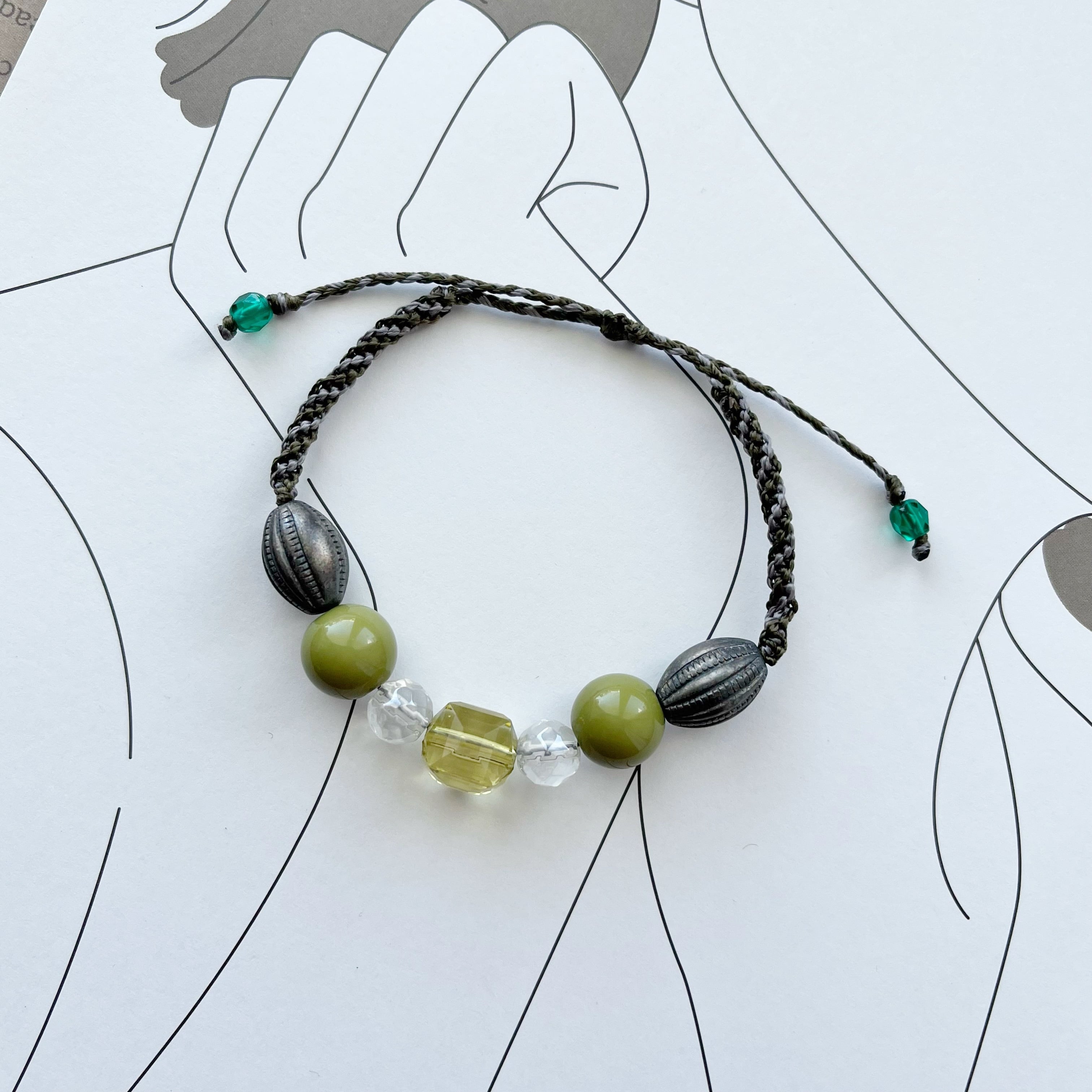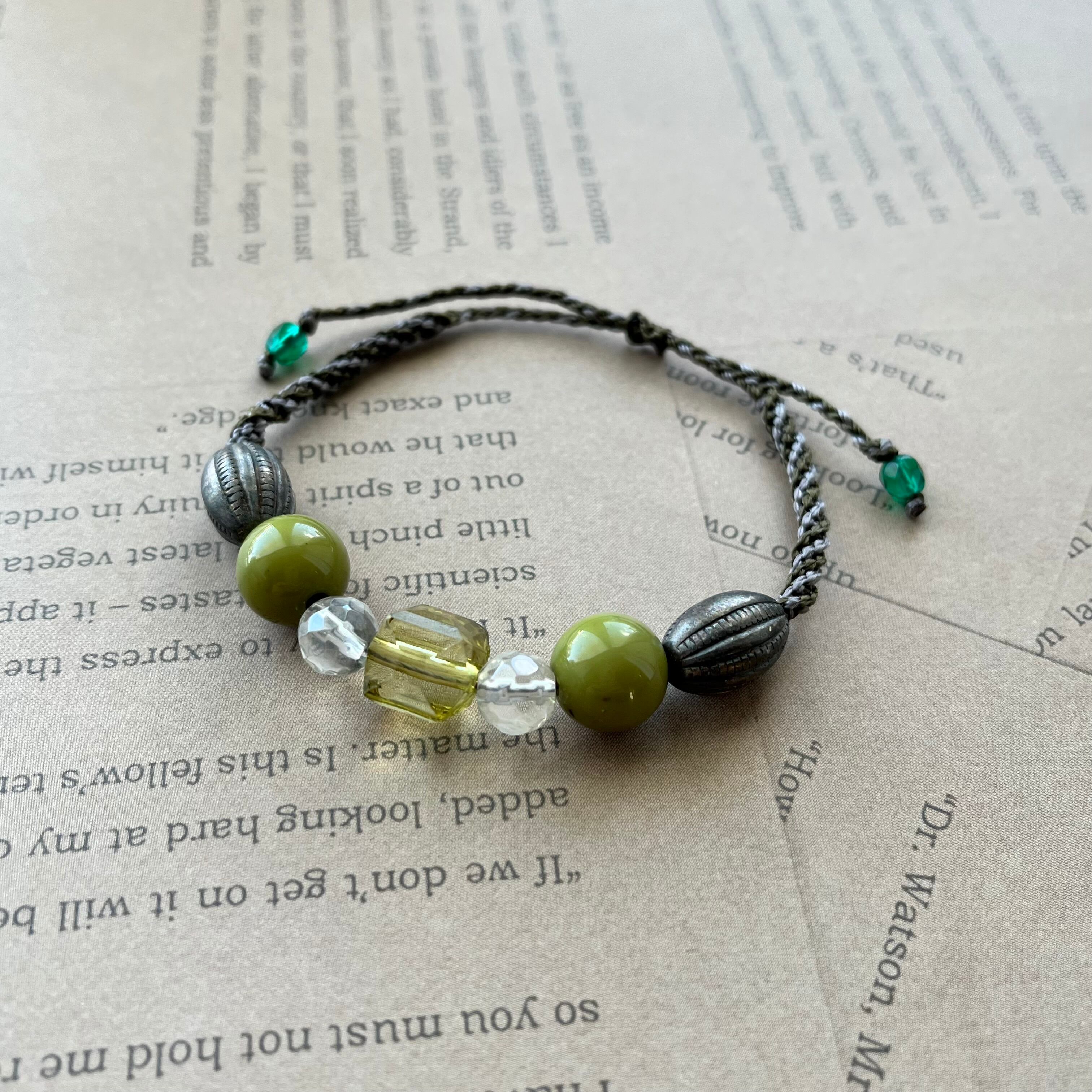 留め具両端を引っ張ることでサイズ調整が可能な、フリーサイズタイプのブレスレットとなります。