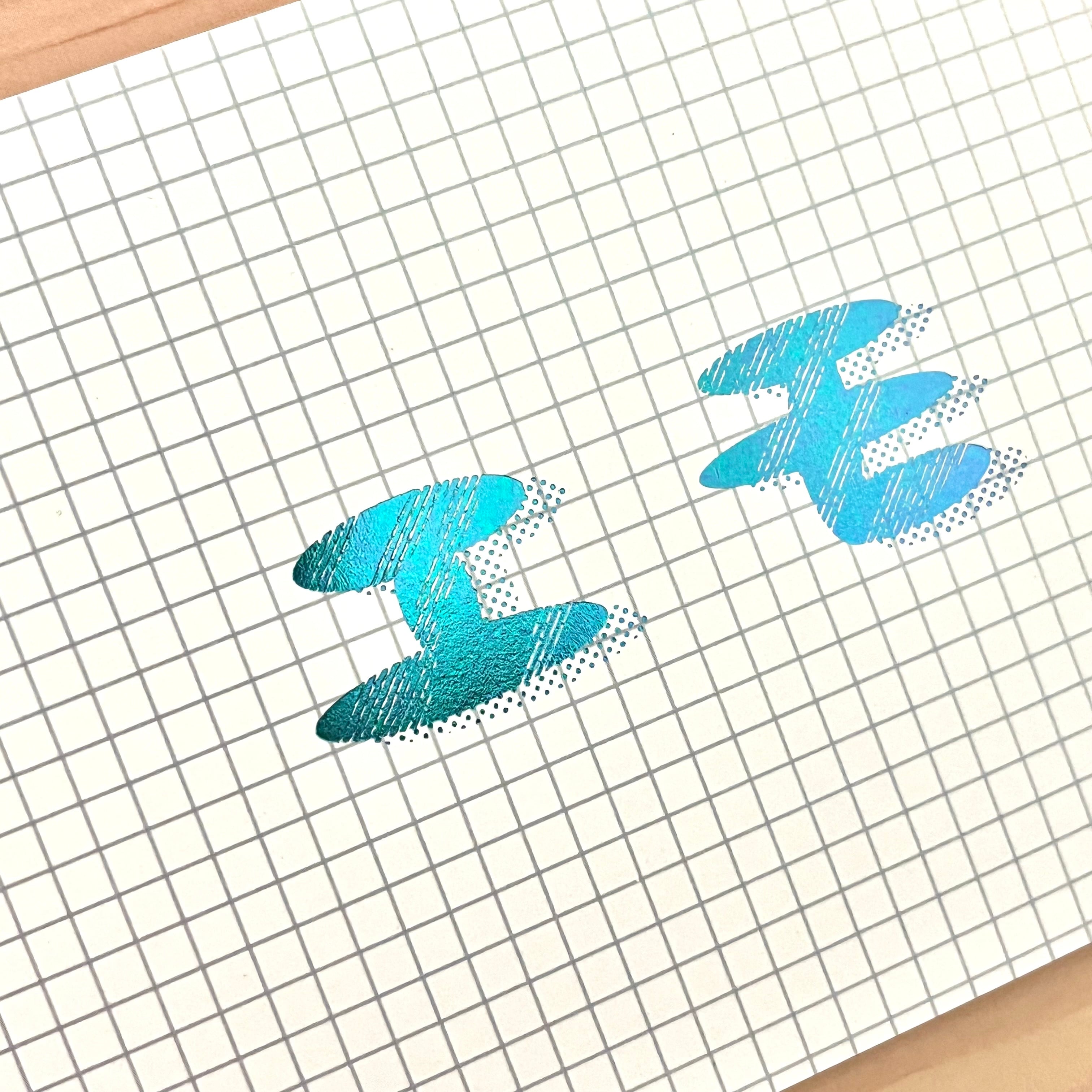 パープル・ブルー・グリーンと、角度によって色を変える箔に丸みのある文字を少しかすれさせて、エモさを表現しました。